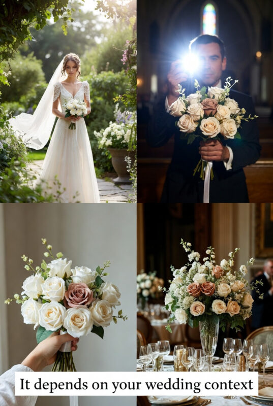 An outdoor summer wedding in the UK needs extra durability against wind and light rain — soap roses and latex handle this far better than fresh flowers. Indoor church weddings with flash photography demand materials that don’t create harsh reflections.