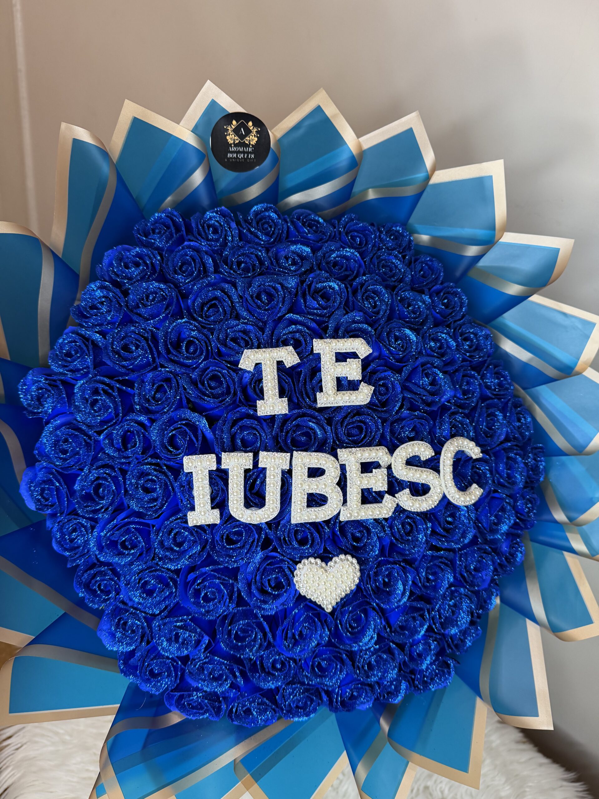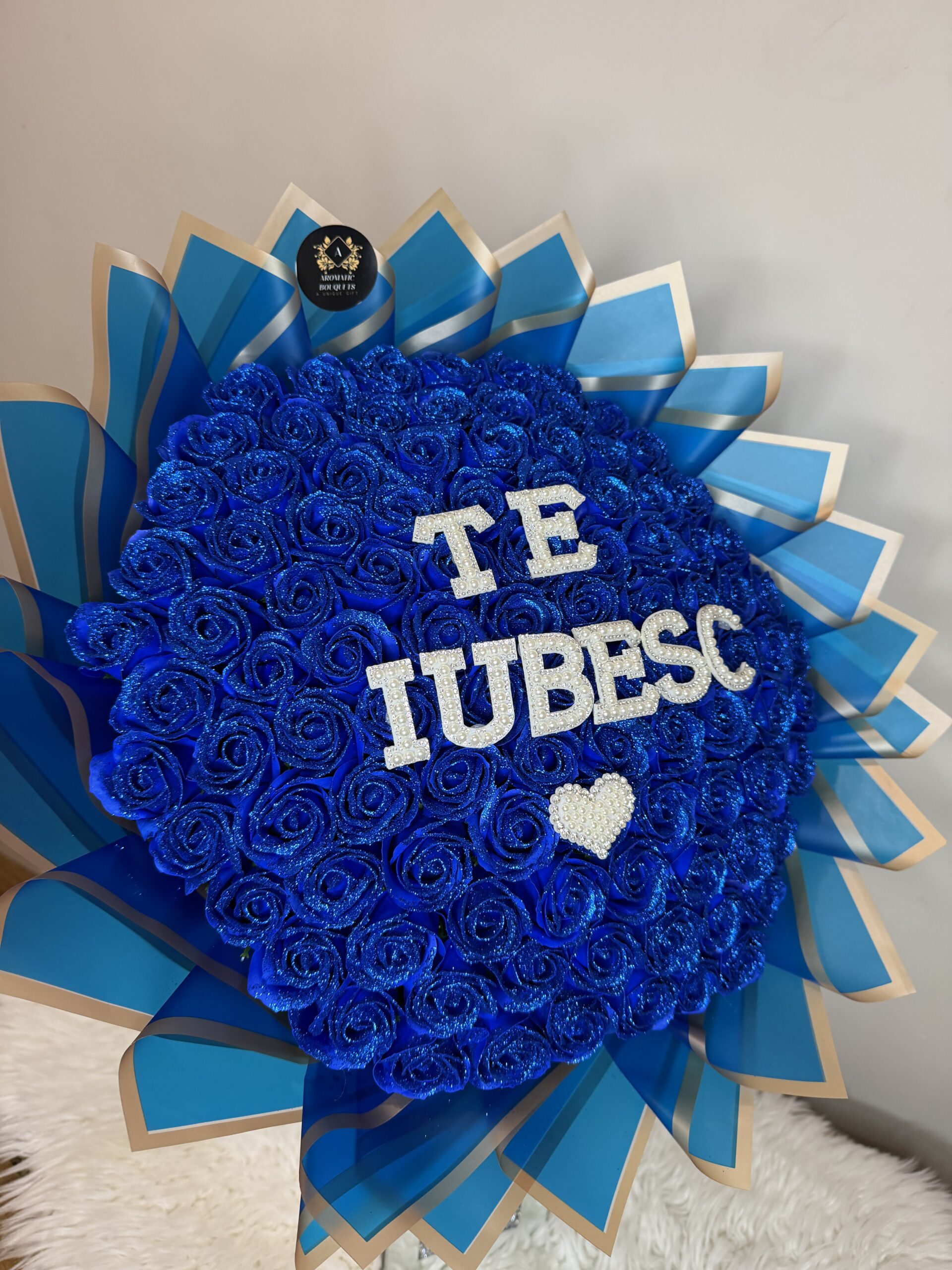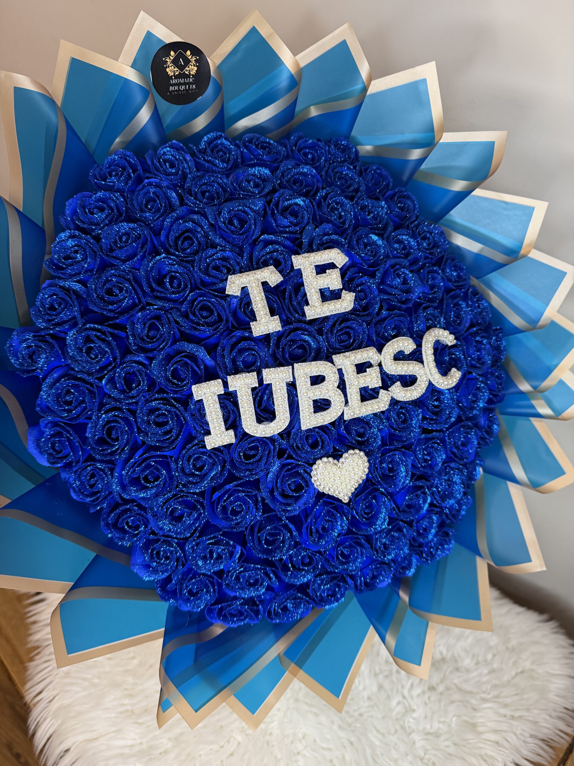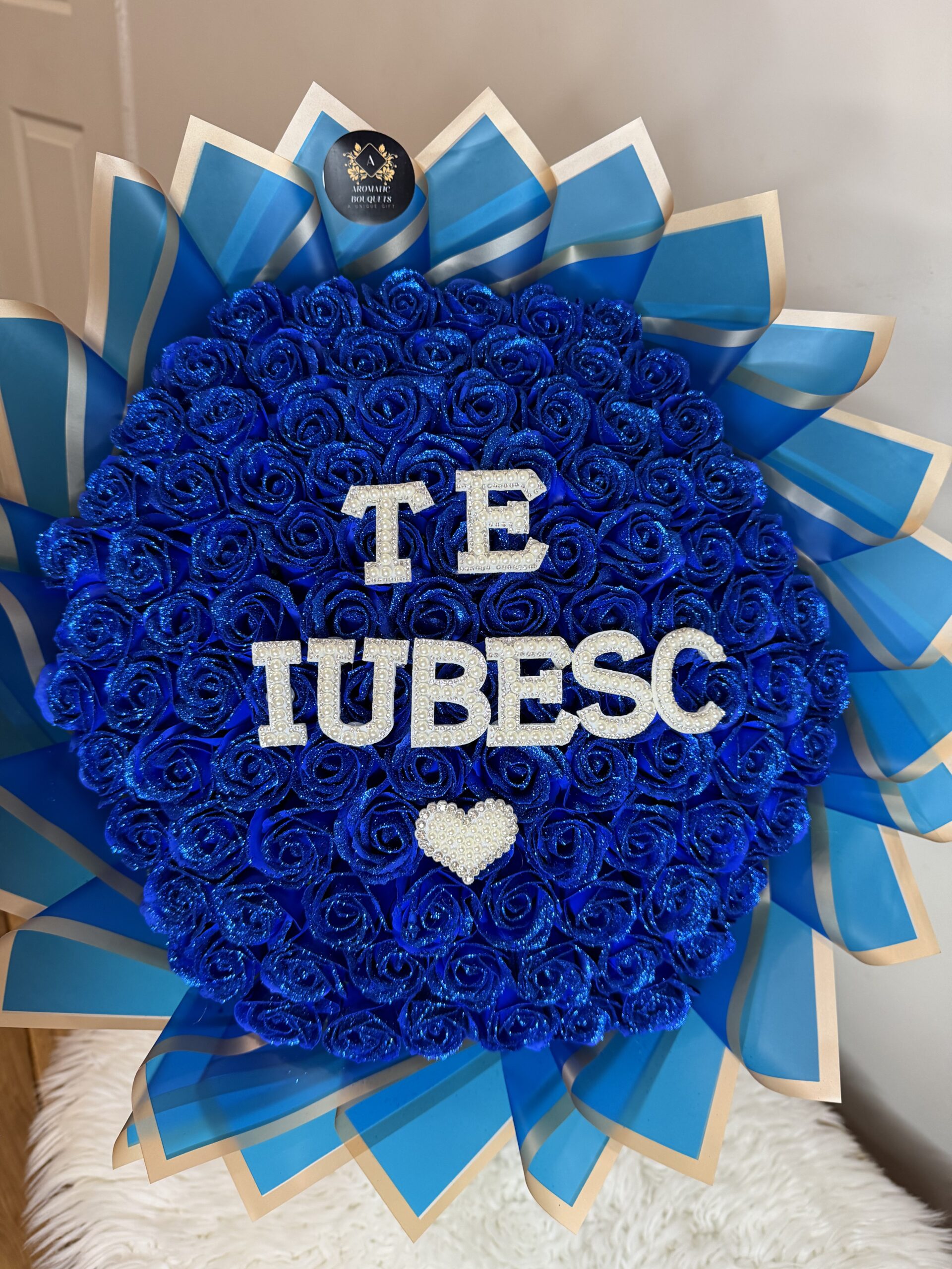 The Azure Devotion bouquet is a captivating arrangement of 101 deep blue soap roses, symbolizing loyalty, trust and everlasting love. Adorned with shimmering crystal-letter detailing that spells “Te Iubesc” and finished with a delicate heart accent, this bouquet make a powerful romantic statement. Wrapped in layered blue and gold-toned accents, each rose is beautifully crafted and lightly scented to last forever. A perfect gift for anniversaries, proposals, birthday’s or expressing love in a truly unforgettable way.