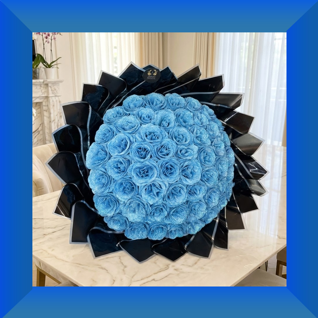 Each rose is made from premium silicone and delicately infused with fine glitter, creating a radiant crystal-like glow that elevates the bouquet into a true statement piece. Finished with sleek black luxury wrapping, this bouquet offers a bold contrast that enhances the vibrant blue roses and delivers a modern, high-end look.