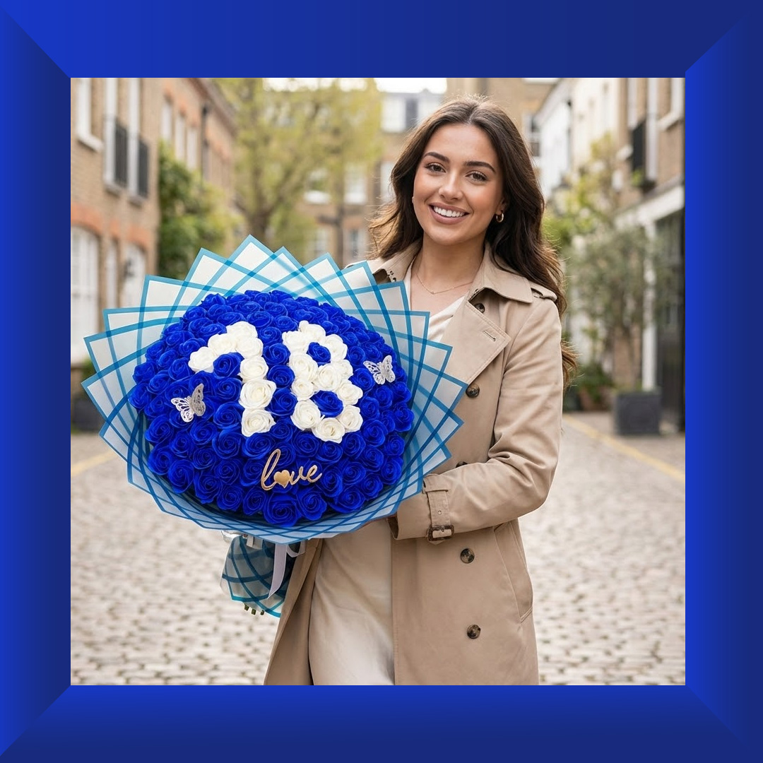 This stunning bouquet features 101 premium soap roses in a rich blend of deep royal blue and elegant ivory white, beautifully arranged to form the number 18, creating a bold and meaningful personalised design.