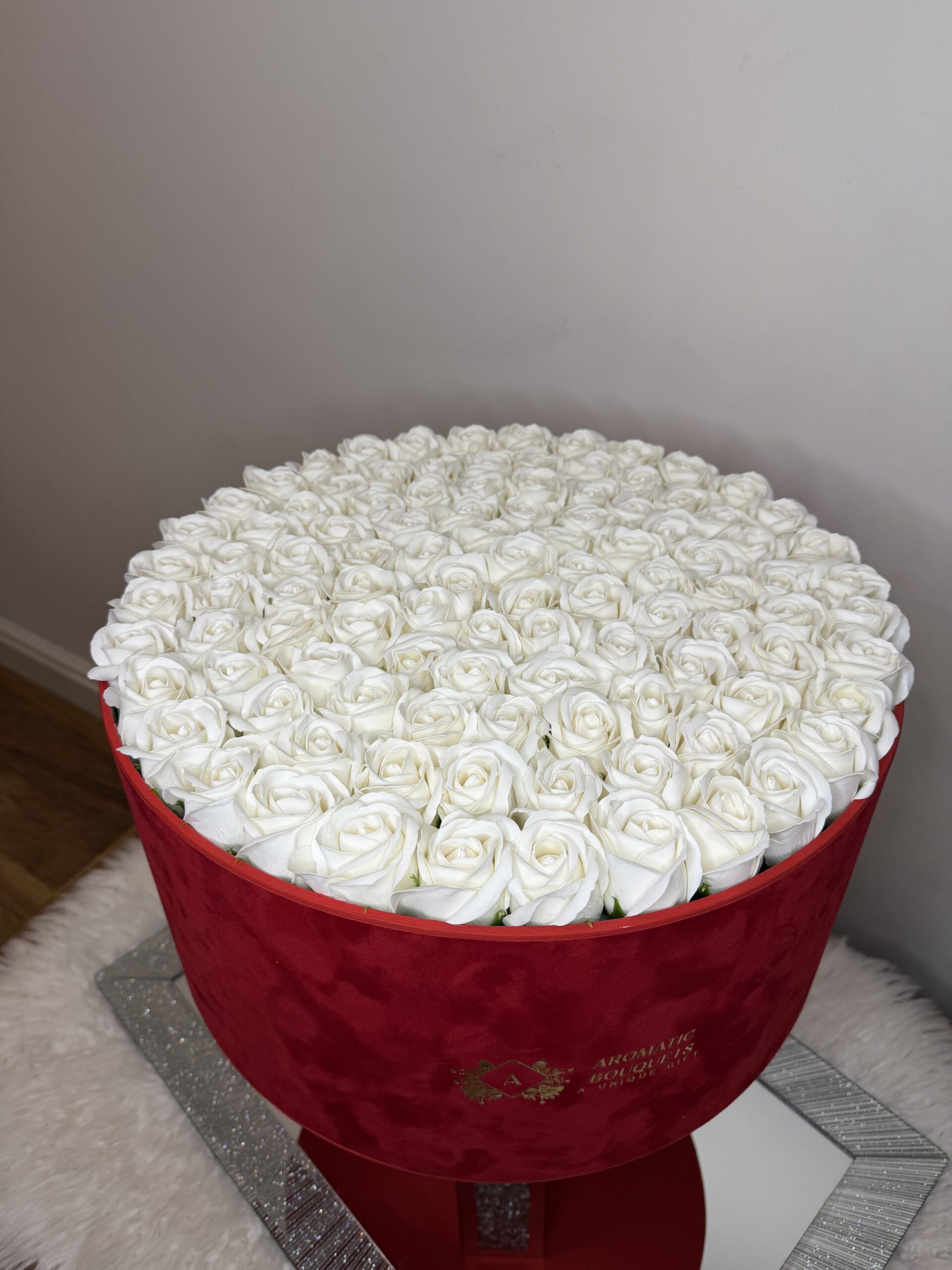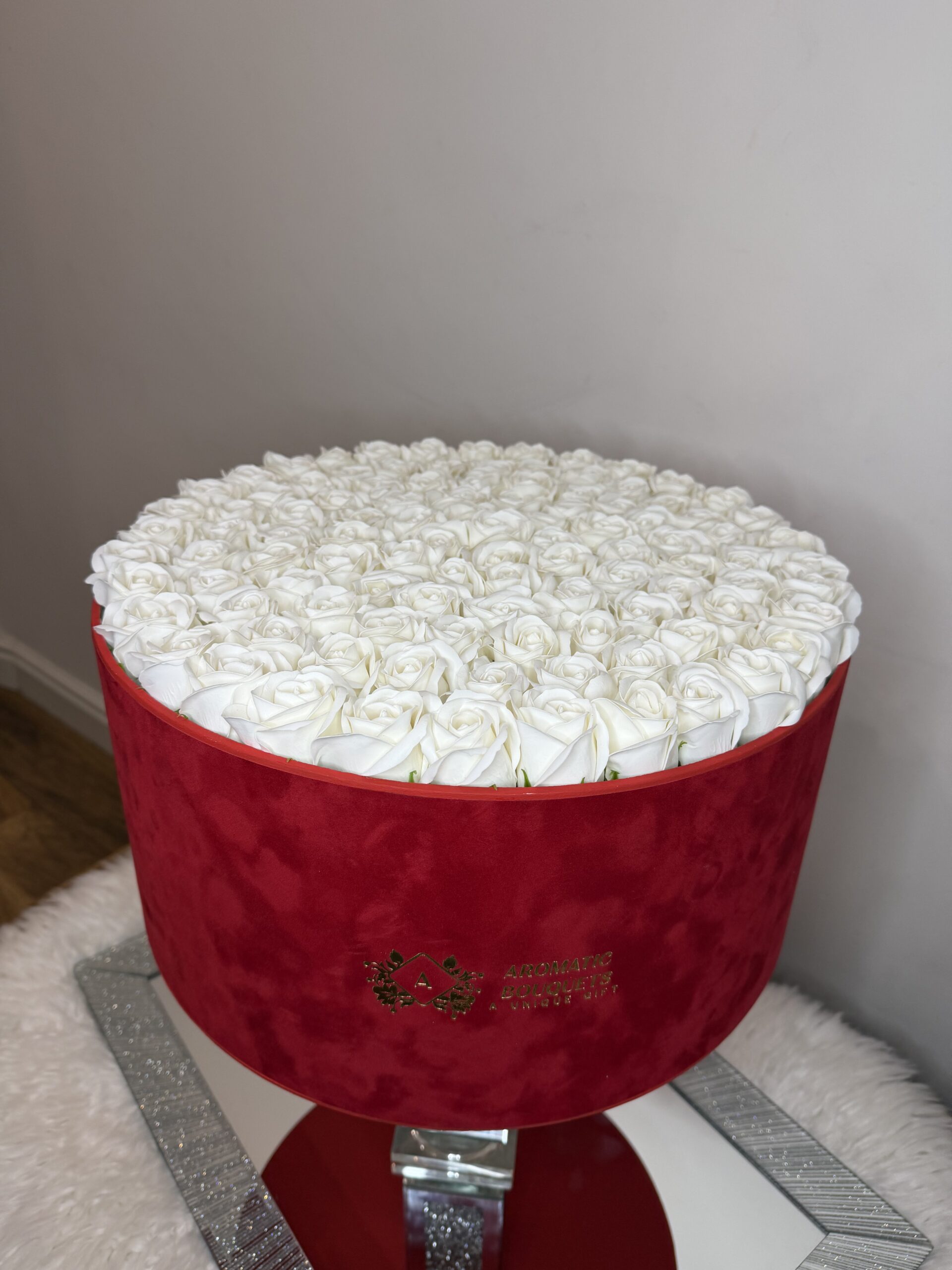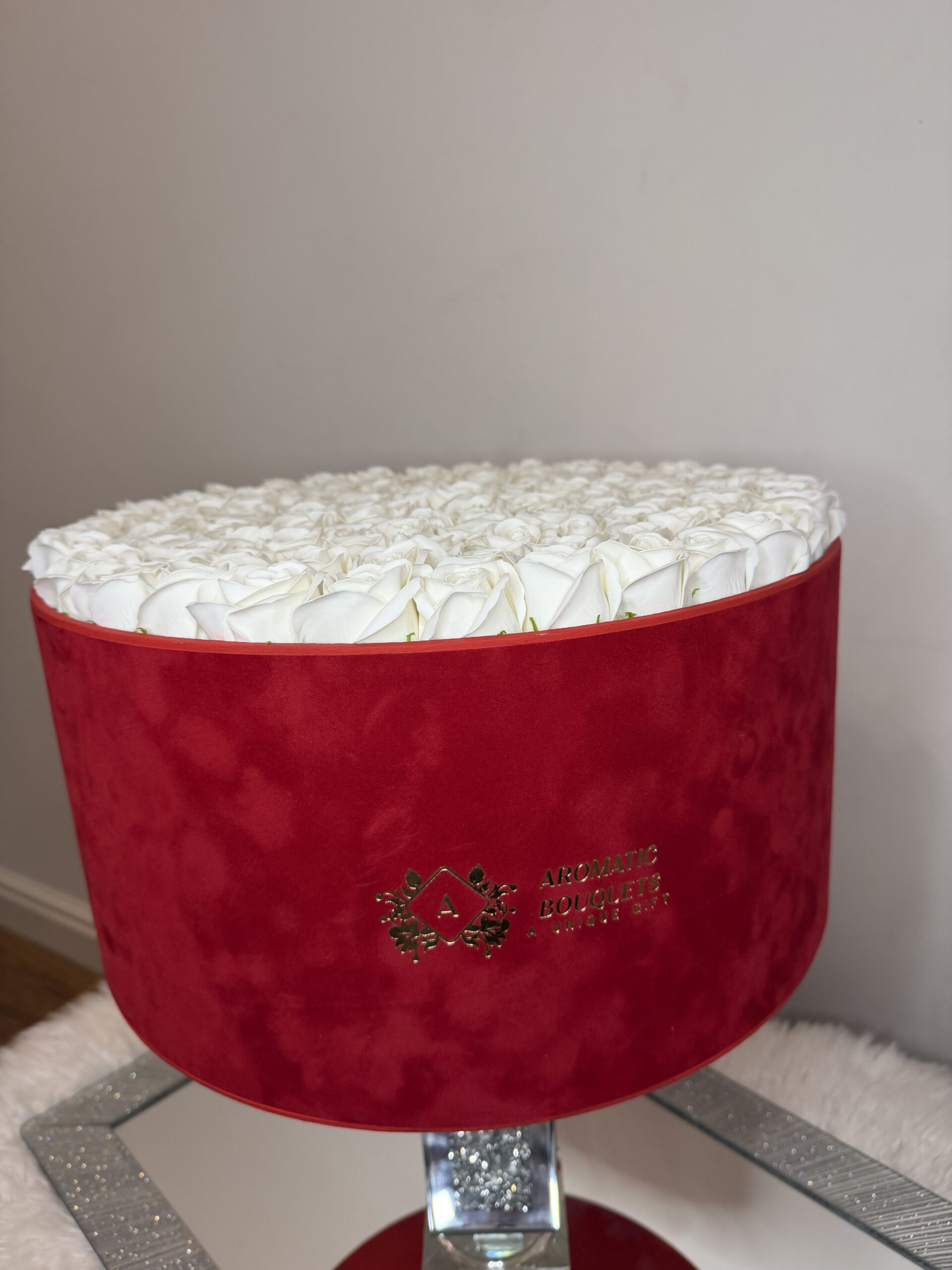Experience refined elegance with the Eternal Ivory Luxe Box. Filled with 101 meticulously sculpted white roses, this arrangement embodies sophistication and serenity. Presented in a bold red suede box with gold detailing, it is a premium keepsake designed to elevate romantic occasions, celebrations or luxurious interiors.