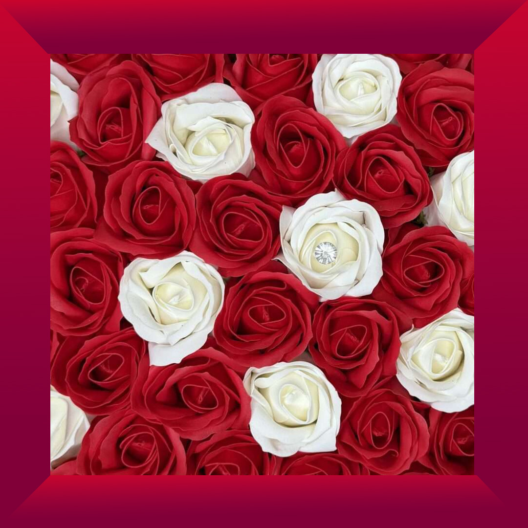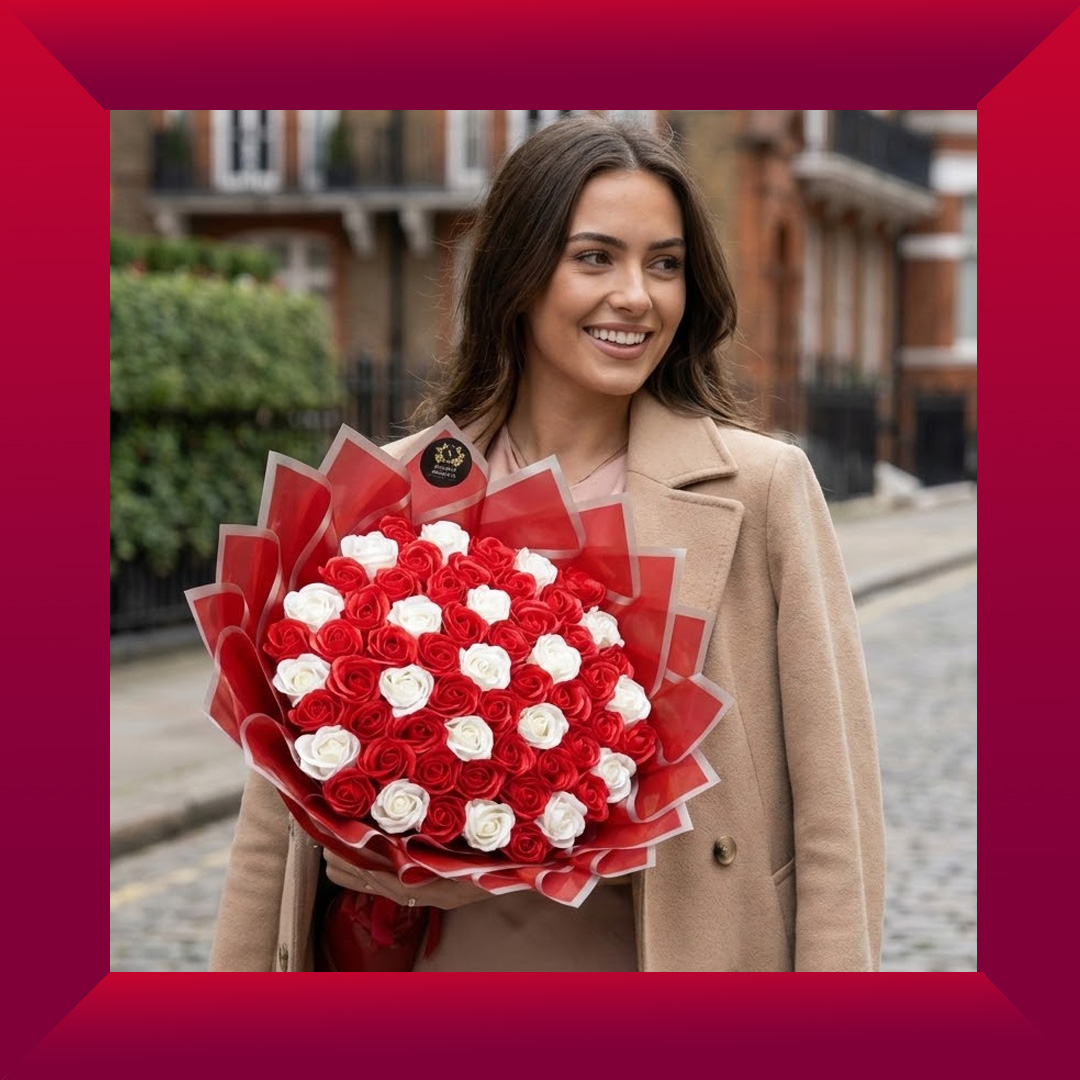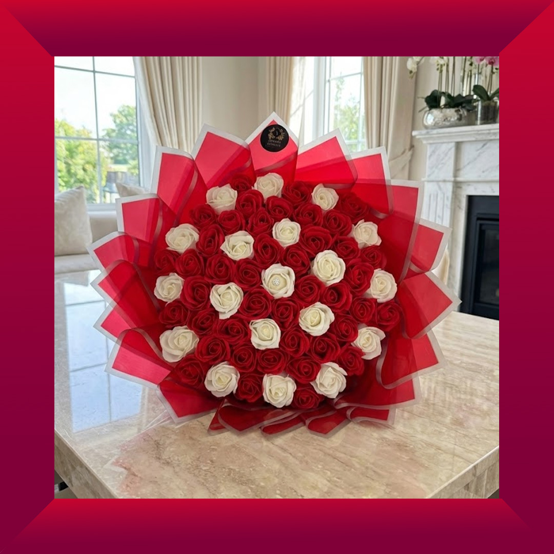 Experience timeless romance with the Eternal Ruby Elegance Bouquet — a luxurious soap rose arrangement designed to symbolise everlasting love, devotion, and passion. This stunning bouquet features 61 exquisitely handcrafted soap roses, beautifully arranged in a striking blend of deep red and pure white tones.