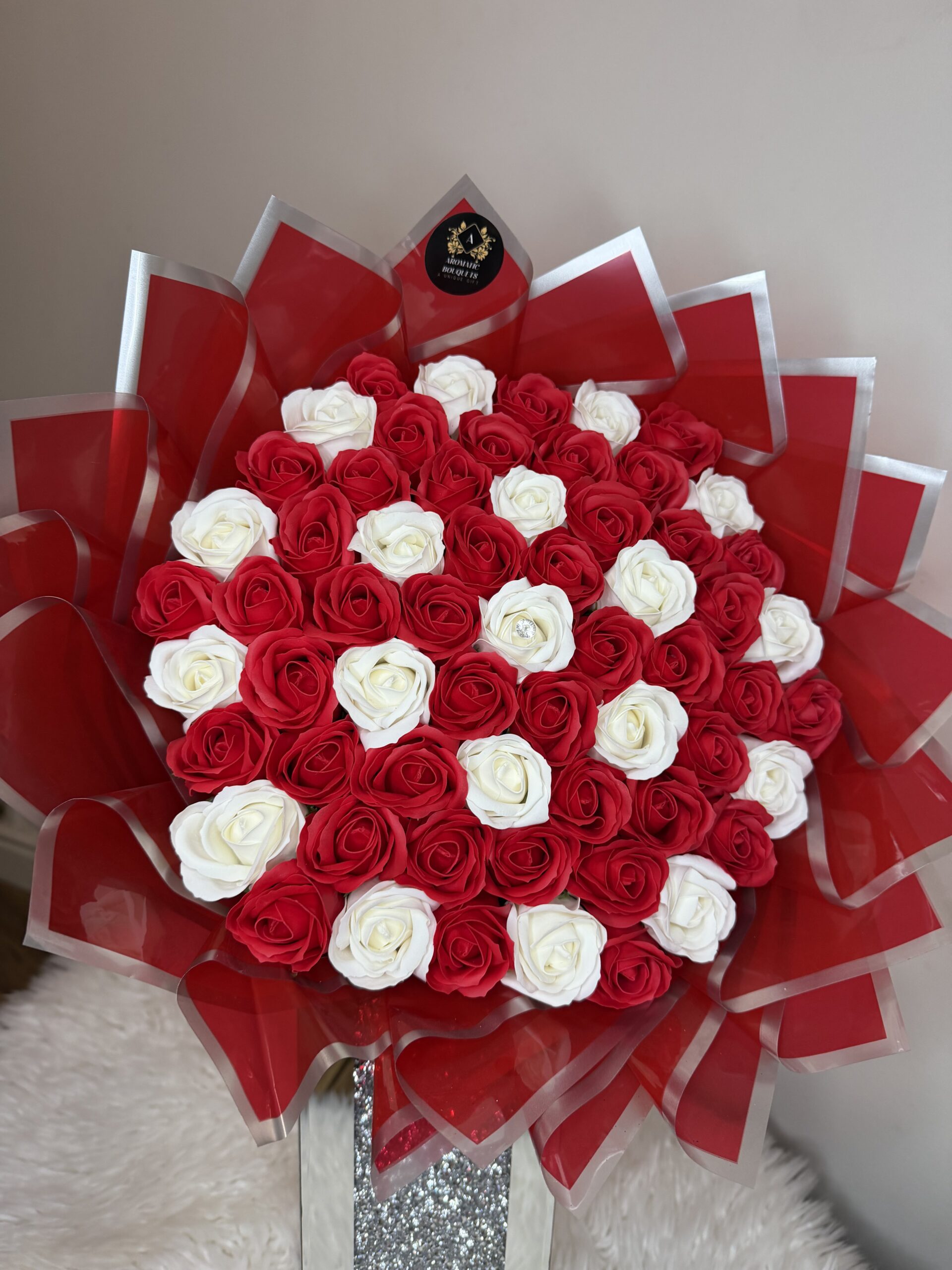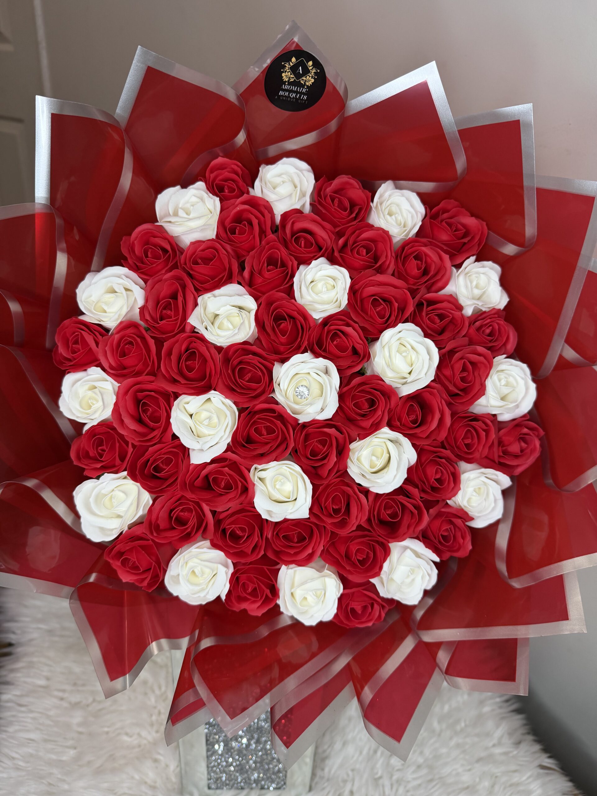 The Eternal Ruby Elegance bouquet features 61 exquisitely crafted soap roses in a striking blend of deep red and pure white. Symbolizing everlasting love, passion and devotion, this luxurious arrangement is beautifully wrapped in bold red accents for a dramatic, romantic finish. Each rose is delicately scented and designed to last, making it a timeless keepsake that will never fade. Perfect for anniversaries, proposals, Valentine’s Day or any moment worth celebrating forever.
