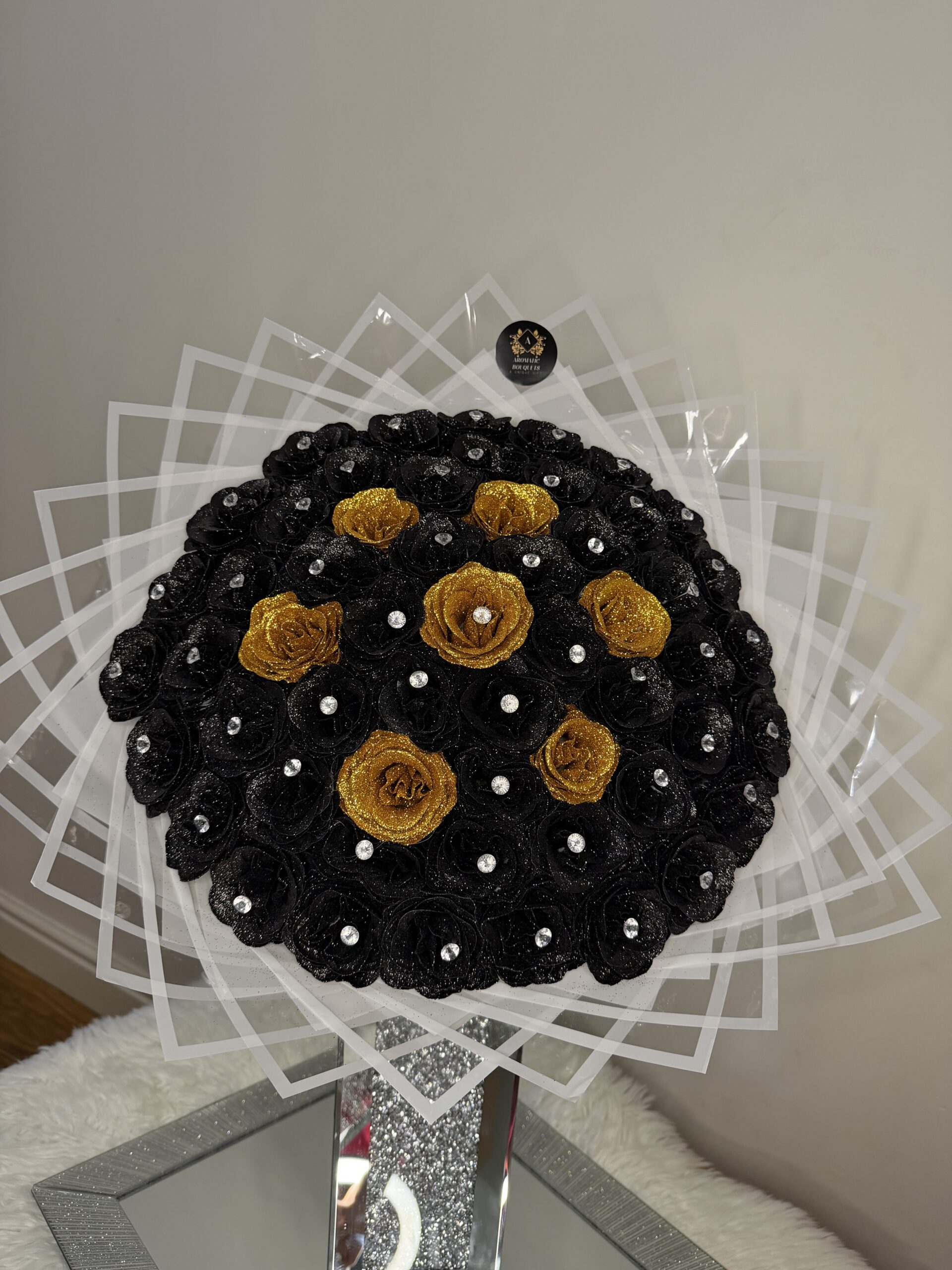 This striking bouquet blends elegance and opulence with its bold arrangement of black glitter silicone roses, accented by radiant gold blooms. Each rose is crafted with shimmering detail, creating a dramatic contrast that instantly captures attention. Scattered pearl-like embellishments add an extra touch of sophistication, while the geometric layered wrap enhances the bouquet’s modern, high-end look. Perfect for luxury gifting, special celebrations or statement decor, this bouquet embodies glamour, uniqueness and timeless style.