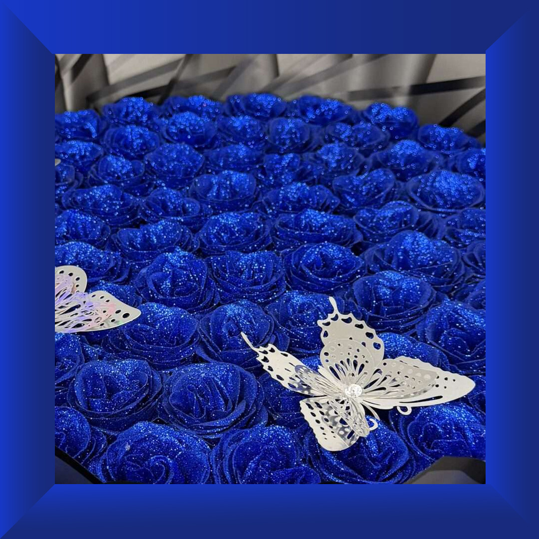 Make a bold and unforgettable impression with the Midnight Sapphire 75 Glitter Rose Grand Bouquet — a breathtaking luxury arrangement designed to capture attention and leave a lasting memory. This stunning bouquet features 75 premium glitter silicone roses in a deep sapphire-blue tone, symbolising loyalty, strength, elegance, and everlasting love.