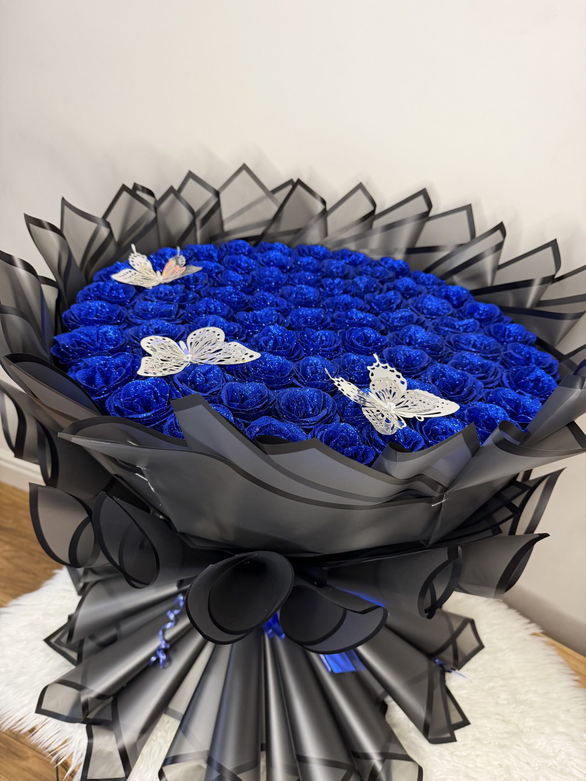 This breathtaking free-standing bouquet showcases a lavish arrangement of deep sapphire-blue glitter silicone roses, creating a bold and luxurious centerpiece. The roses shimmer beautifully under the light, giving the bouquet a captivating, jewel-like radiance. Surrounding the display in a elegant black layered wrap with dramatic petal-style folds, adding depth, contrast and a modern touch of sophistication. Delicate metallic butterflies rest gracefully atop the roses, enhancing the bouquet with a sense of softness and charm. Perfect for grand celebrations, statement gifts, or elegant decor, this bouquet delivers glamour, presence and unforgettable beauty.