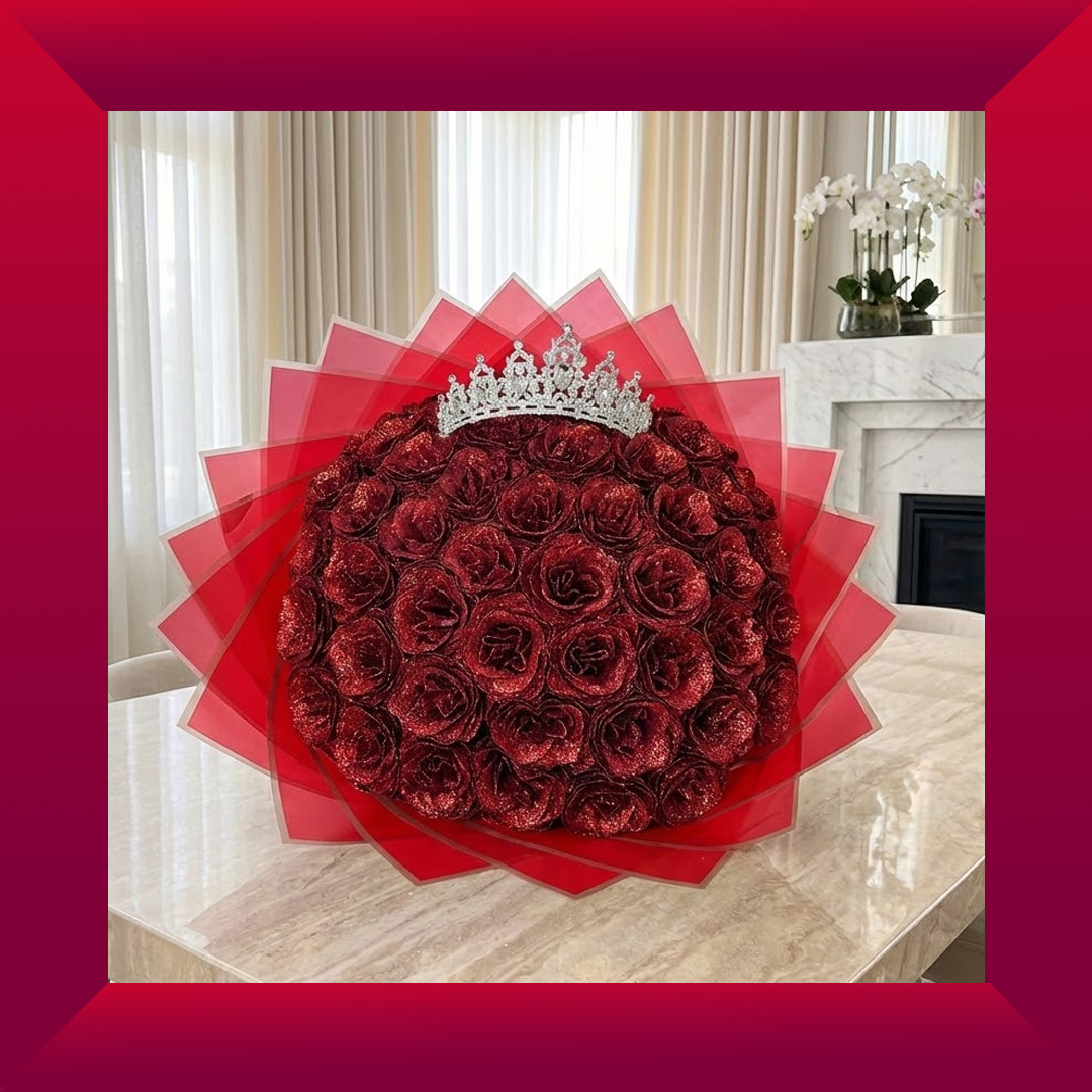 Each rose is crafted with precision to mimic the natural beauty of fresh blooms while offering lasting elegance. Crowned with a dazzling silver tiara, this bouquet exudes regal charm – perfect for celebrating someone truly special. Wrapped in layers of bold red and blush-toned paper, it’s an unforgettable gift for birthdays, anniversaries, or any moment deserving of a queen’s touch.