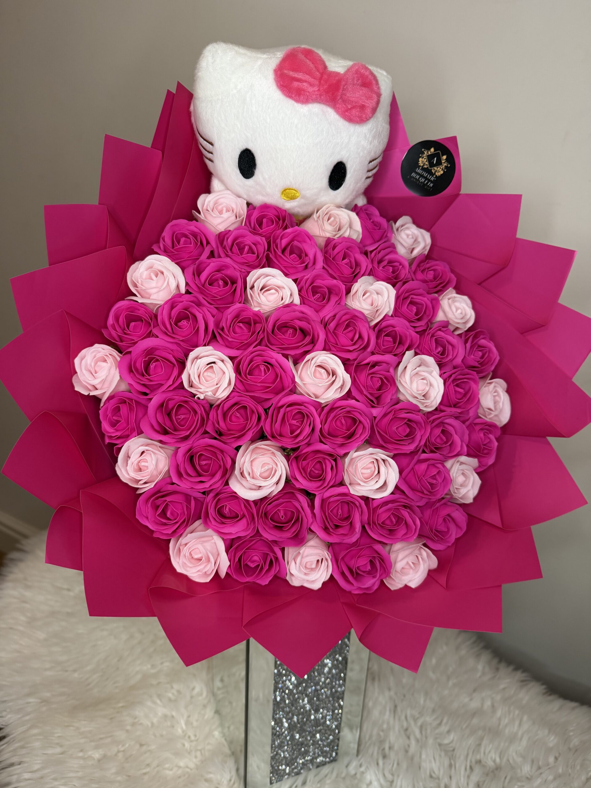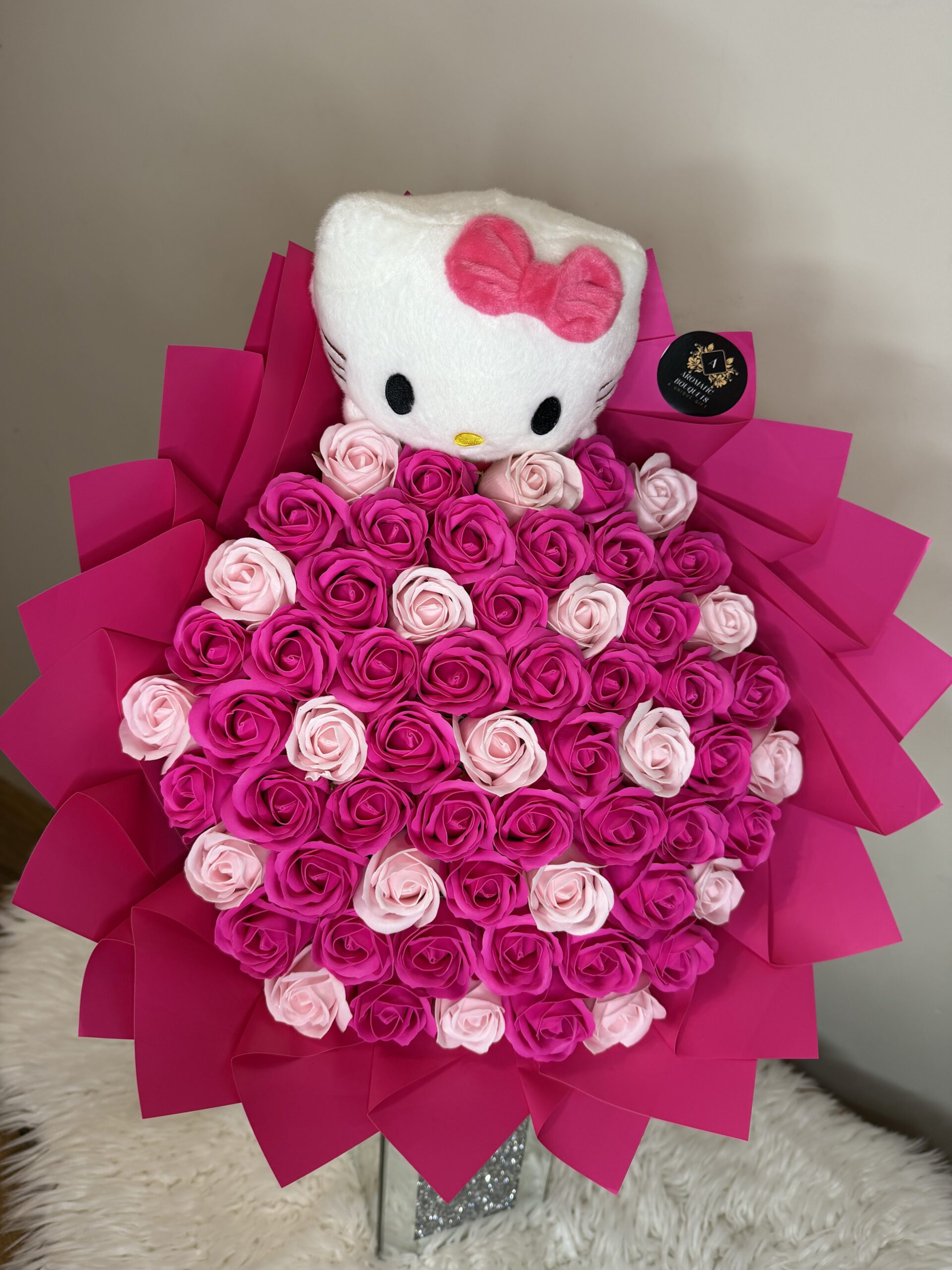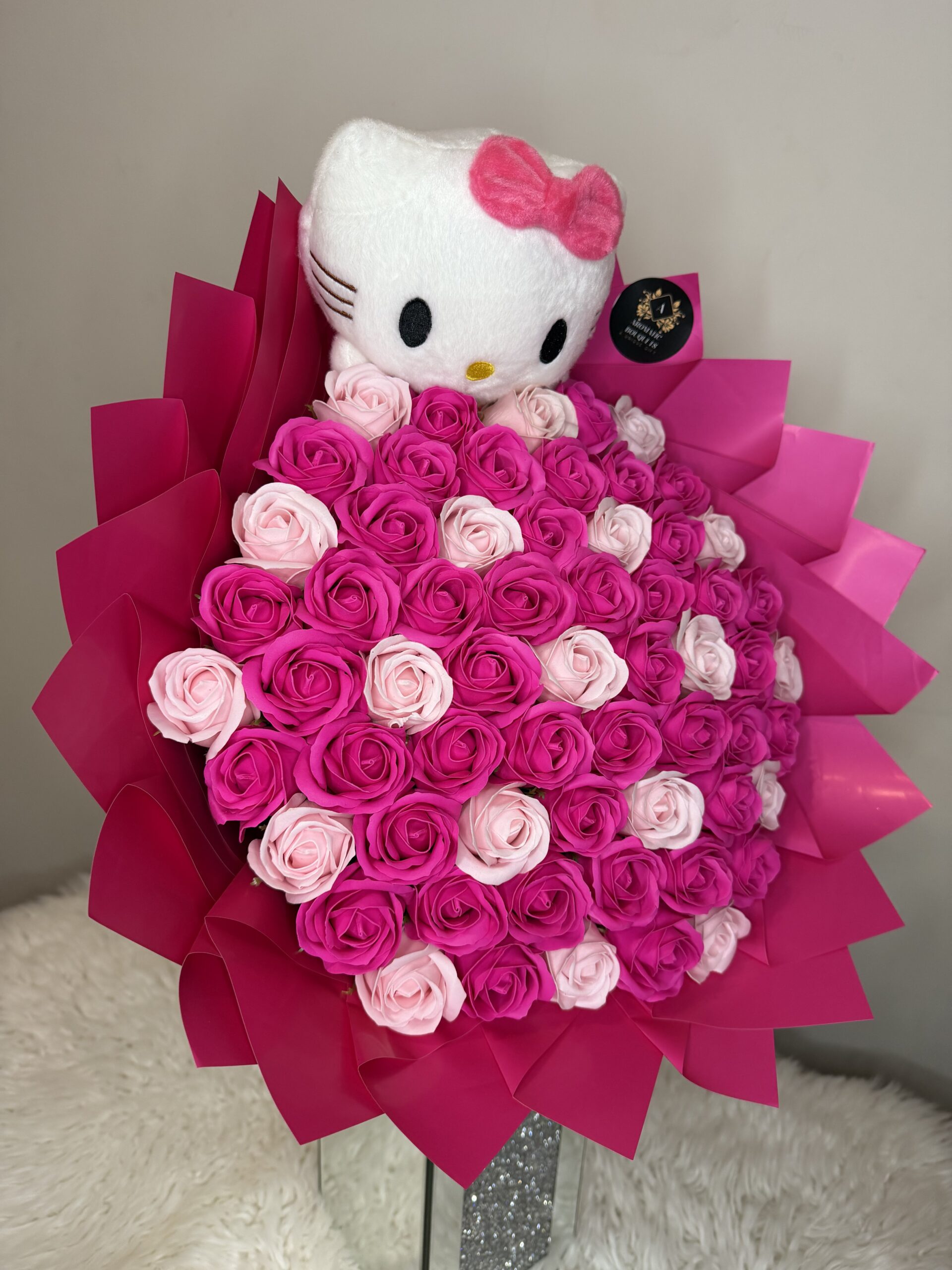 The Sweet Kitty Dreams bouquet is an adorable arrangement of 61 handcrafted soap roses in vibrant pink and soft blush tones, topped with a lovable Hello Kitty plush for an extra touch of sweetness. Wrapped in bold pink layers and lightly scented, this bouquet blends playful charm with lasting beauty. Designed to never wilt, it’s the perfect keepsake gift for birthdays, Valentine’s Day, anniversaries, baby showers or simply to make someone smile.