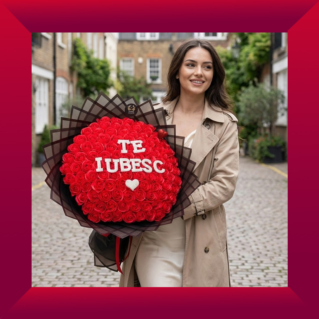 A breathtaking 101 red soap rose bouquet with crystal “Te Iubesc” lettering and elegant black wrapping. A luxury long-lasting romantic gift with UK delivery.